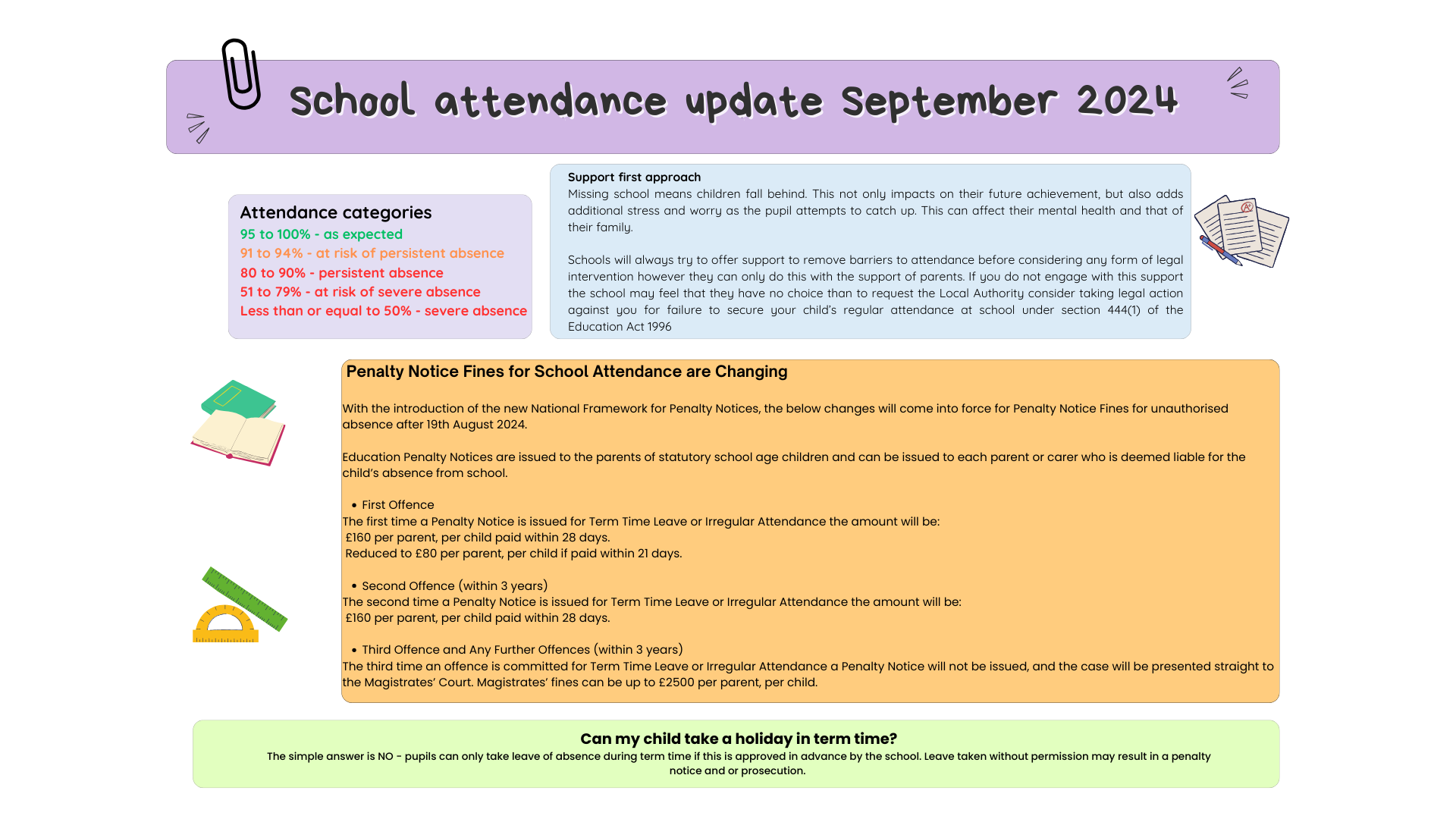 Where attendance is below the expected level, we want to work closely with families to support improving this. Rachel Mellor, our family support worker, will give you a ring to check on anyone this has not contacted the school to explain why their child isn't in. If we notice a pattern of poor attendance you will be invited to a meeting with our Safeguarding Lead. This is a great opportunity to share any difficulties you might be having at home, and help us understand why school attendance is providing difficult. Sometimes an easy fix can resolve things. For example, setting up a reward chart or giving parents some morning routine tips. If we work together, attendance usually improves quickly. Where further, ongoing support is required, school staff will continue regular meetings and help as required.